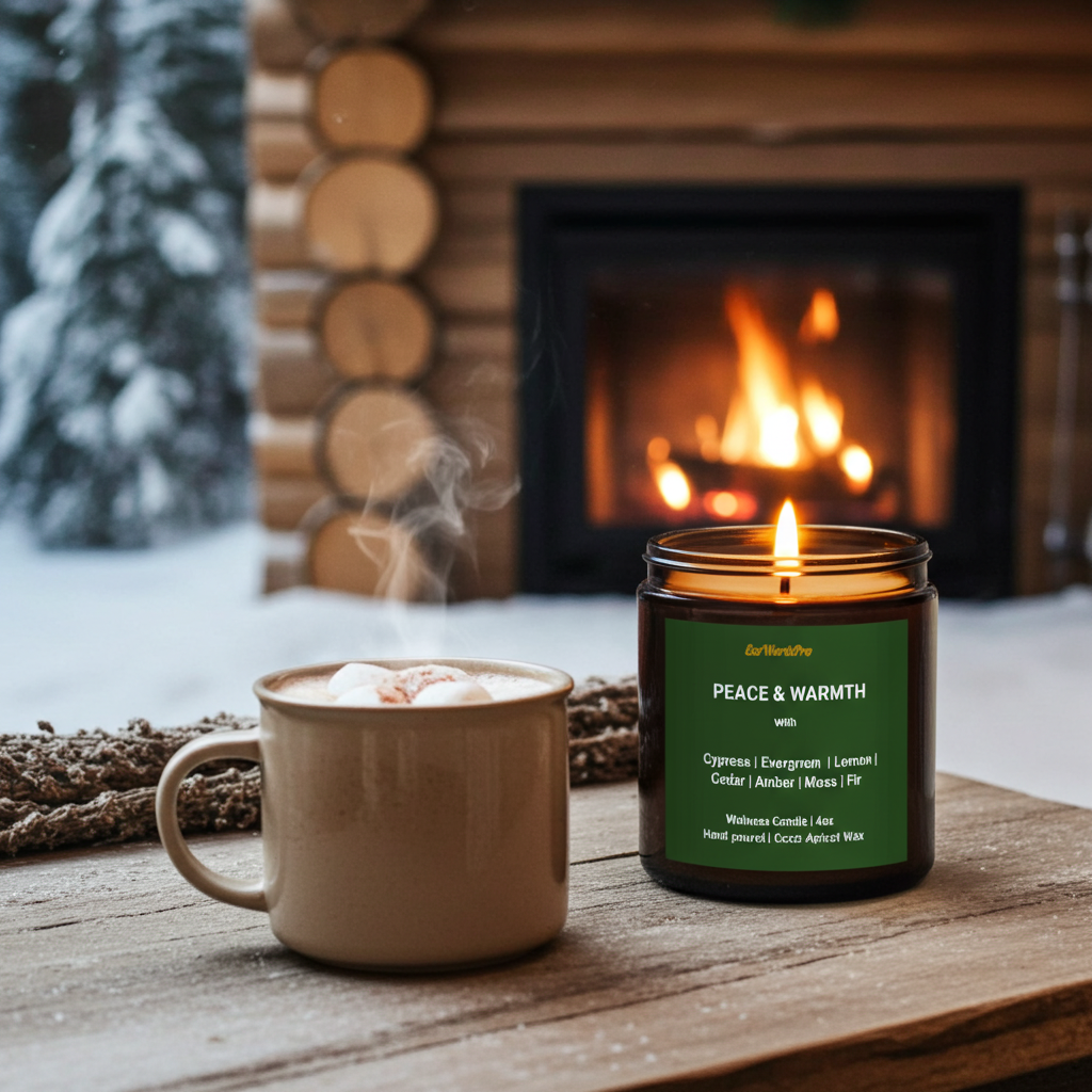 Escape to the stillness of the forest with the Peace & Warmth Winter Forest Candle. Hand-poured with luxurious coconut-apricot wax and infused with a natural blend of cypress, cedar, fir, evergreen, lemon peel, amber, and moss, this calming candle evokes the scent of quiet woods and emotional warmth.